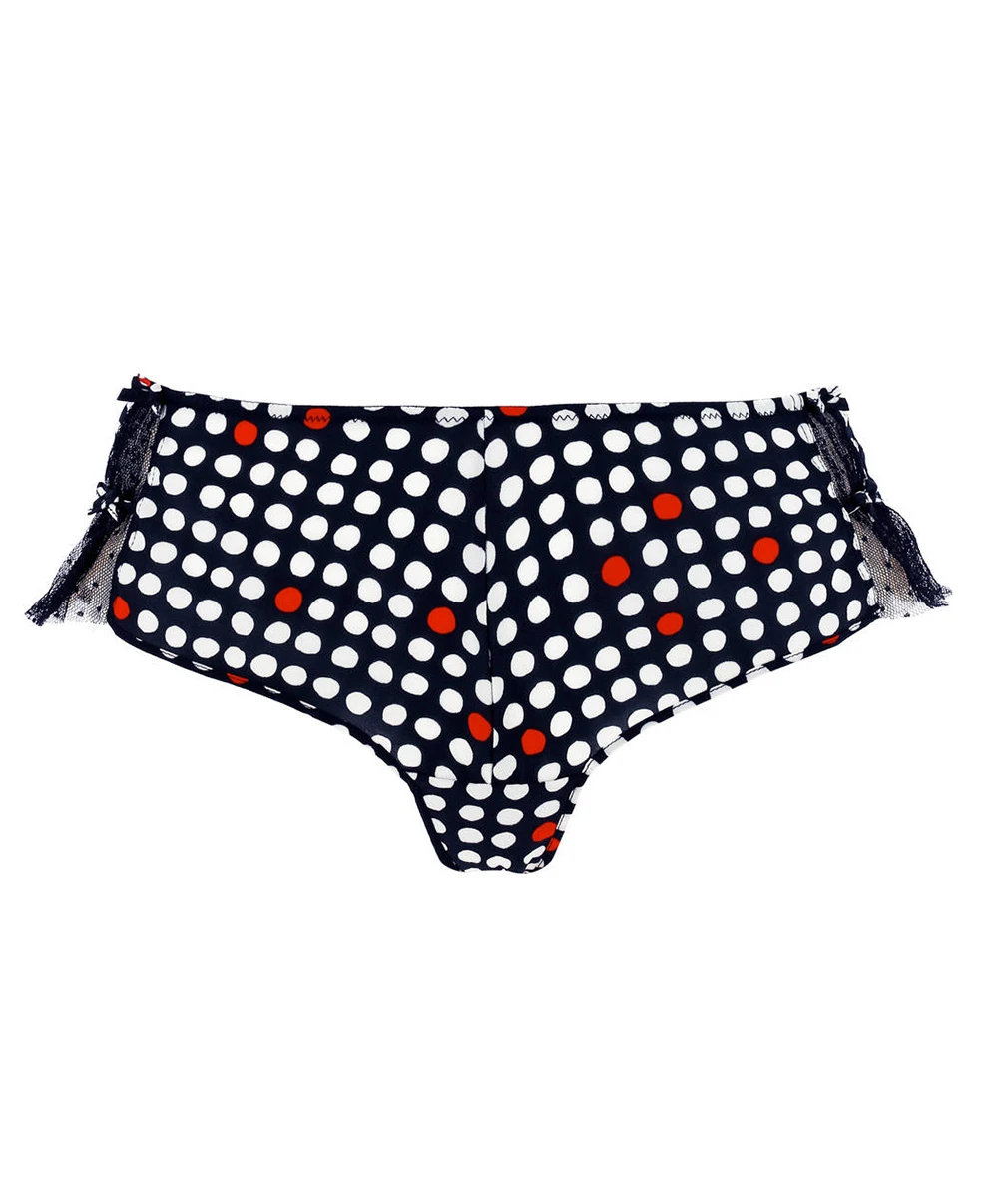 Boxer Chantal Thomass de la collection Frivole. Ce shorty a été confectionné en maille crêpe à l’aspect gaufré très aérienne arborant un élégant imprimé à pois blancs et rouges sur une base noire. Vos hanches seront subtilement mises en valeurs et se laisseront entrevoir par deux empiècements de tulle plumetis ornés de deux noeuds de satin. Au raffinement extrême de cette pièce vous ajouterez un indéniable côté glamour avec sa taille mi-basse et sa coupe légèrement échancrée au dos qui mettra en exergue le galbe de vos fesses.