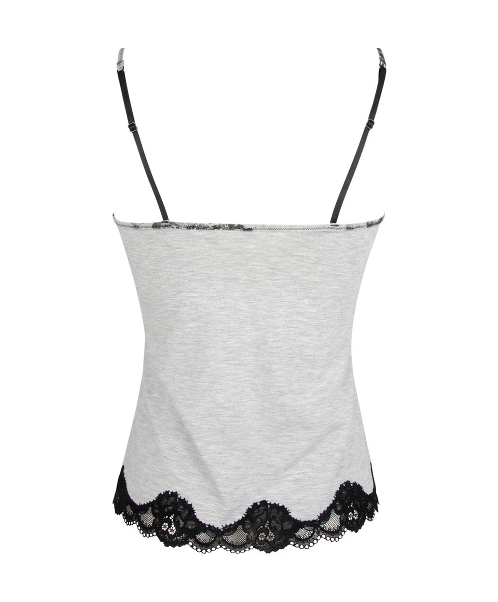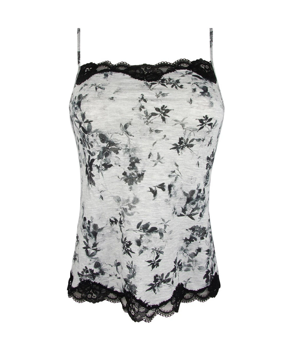 -Vêtement confectionné en maille coton micromodal grise chinée tonique pour un bien-être et un fitting incomparables, présentant des végétaux imprimés à l’encre de Chine, et se mariant à merveille avec des détails et des inserts en dentelle Leavers noire pour un contraste efficace.
