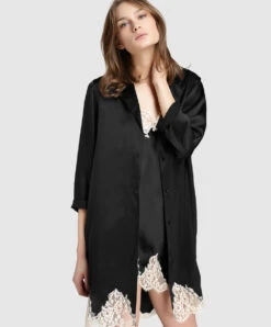 Chemise en soie Lise Charmel collection Splendeur Soie. Cette superbe chemise de nuit en soie a été confectionné dans une matière de légende pour une douceur et un confort incomparables. Elle présente sur son bord inférieur un superbe empiècement de dentelle de Calais florale qui ajoute encore à la richesse visuelle de ce vêtement en soie. Ce superbe article de lingerie de soie offre également une boutonnière discrète façon kimono asiatique et un col à revers très élégant rappelant un peu l’encolure d’un smoking ou d’une veste de tailleur.