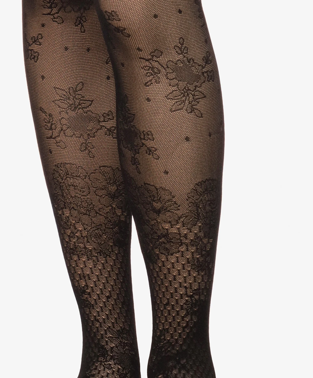 -Collant base fine 20D offrant une ceinture sans coutures, décoré de dentelle florale en jacquard, parée d’un motif plumetis. En finitions, à la cheville et aux pieds, une résille se superpose à la dentelle pour un mix audacieux et moderne.