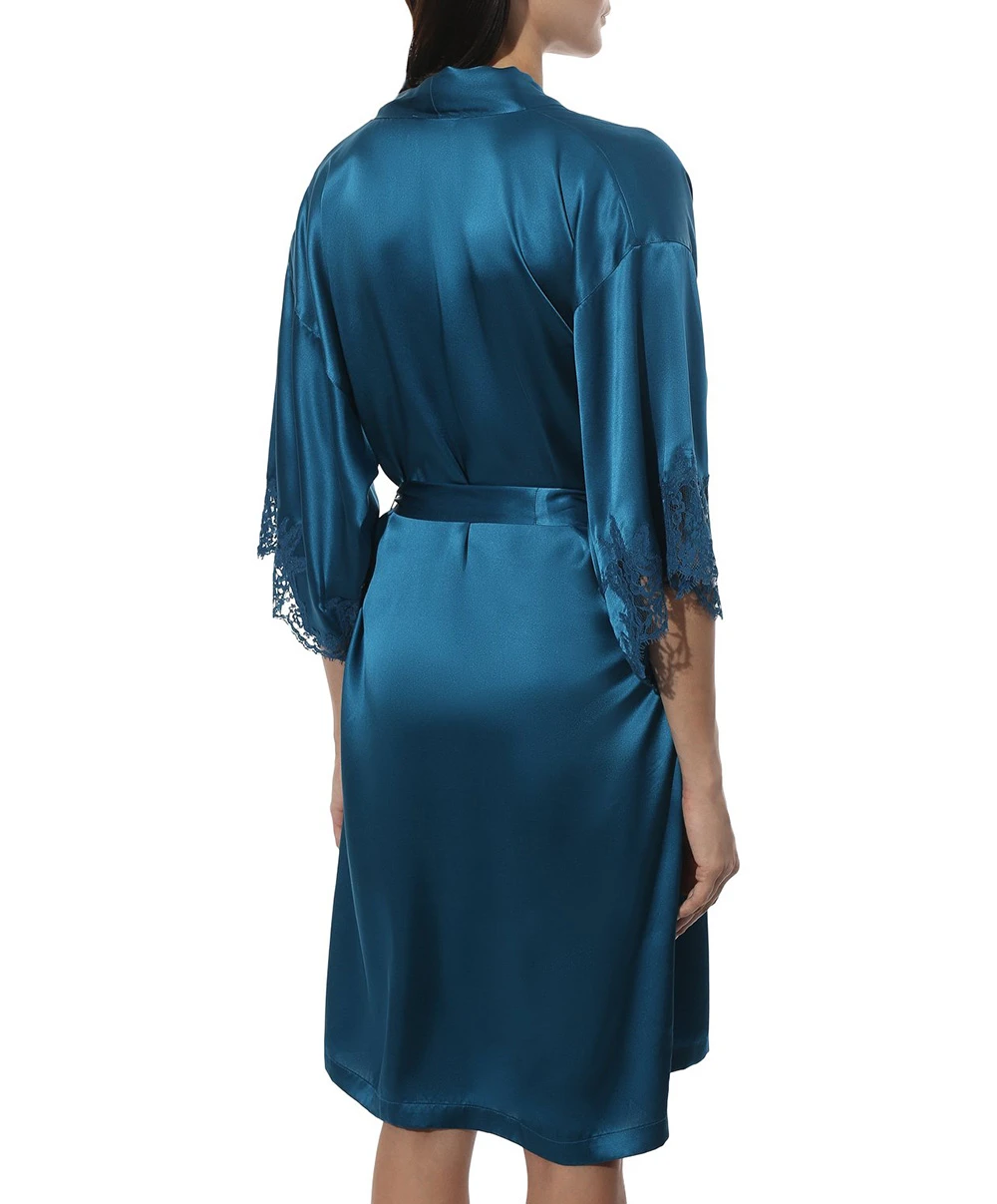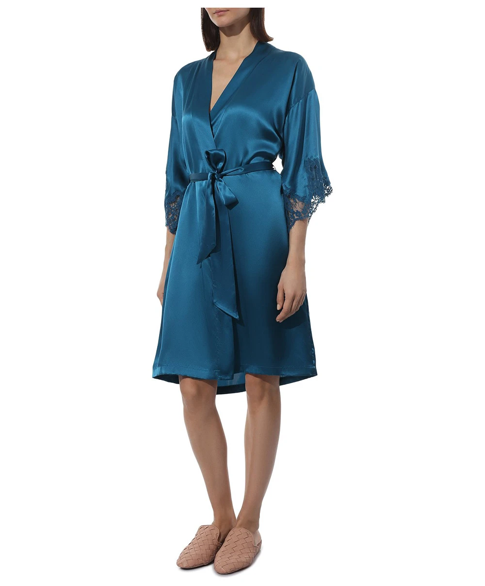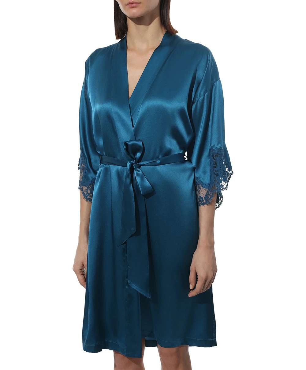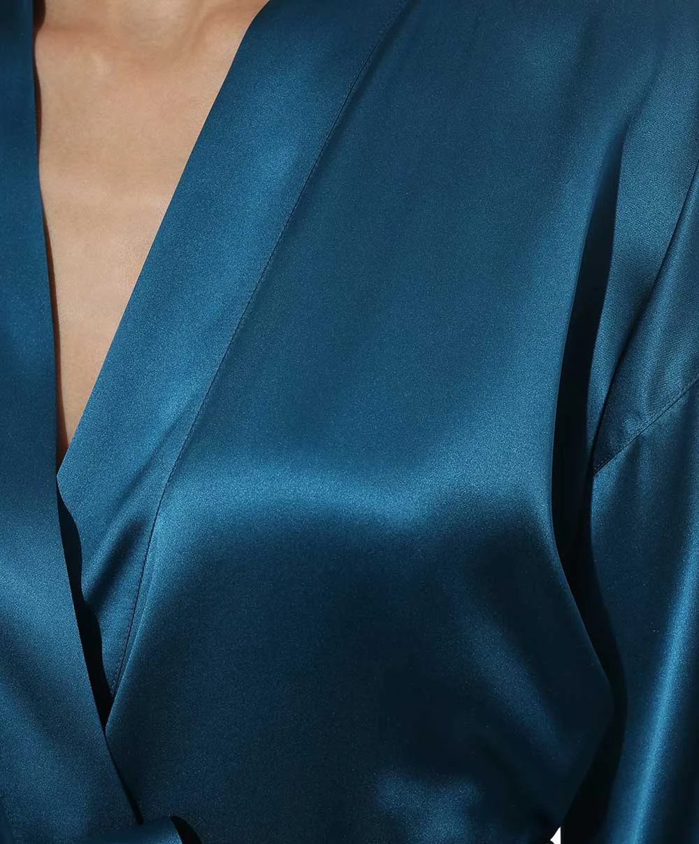 Déshabillé court en soie Lise Charmel collection Splendeur Soie coloris cyan à mi-chemin entre le bleu et le vert, dans l’esprit d’un plumage de paon.