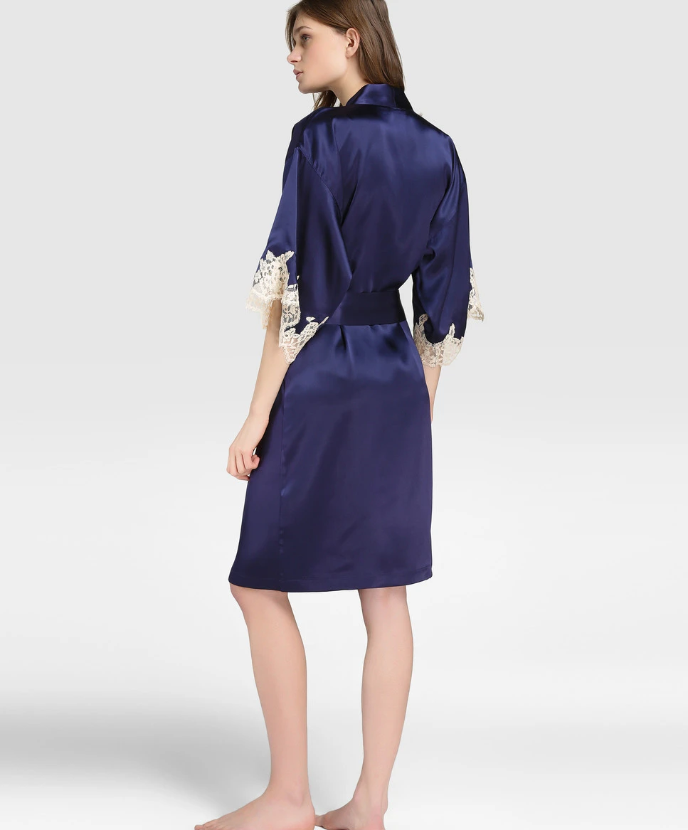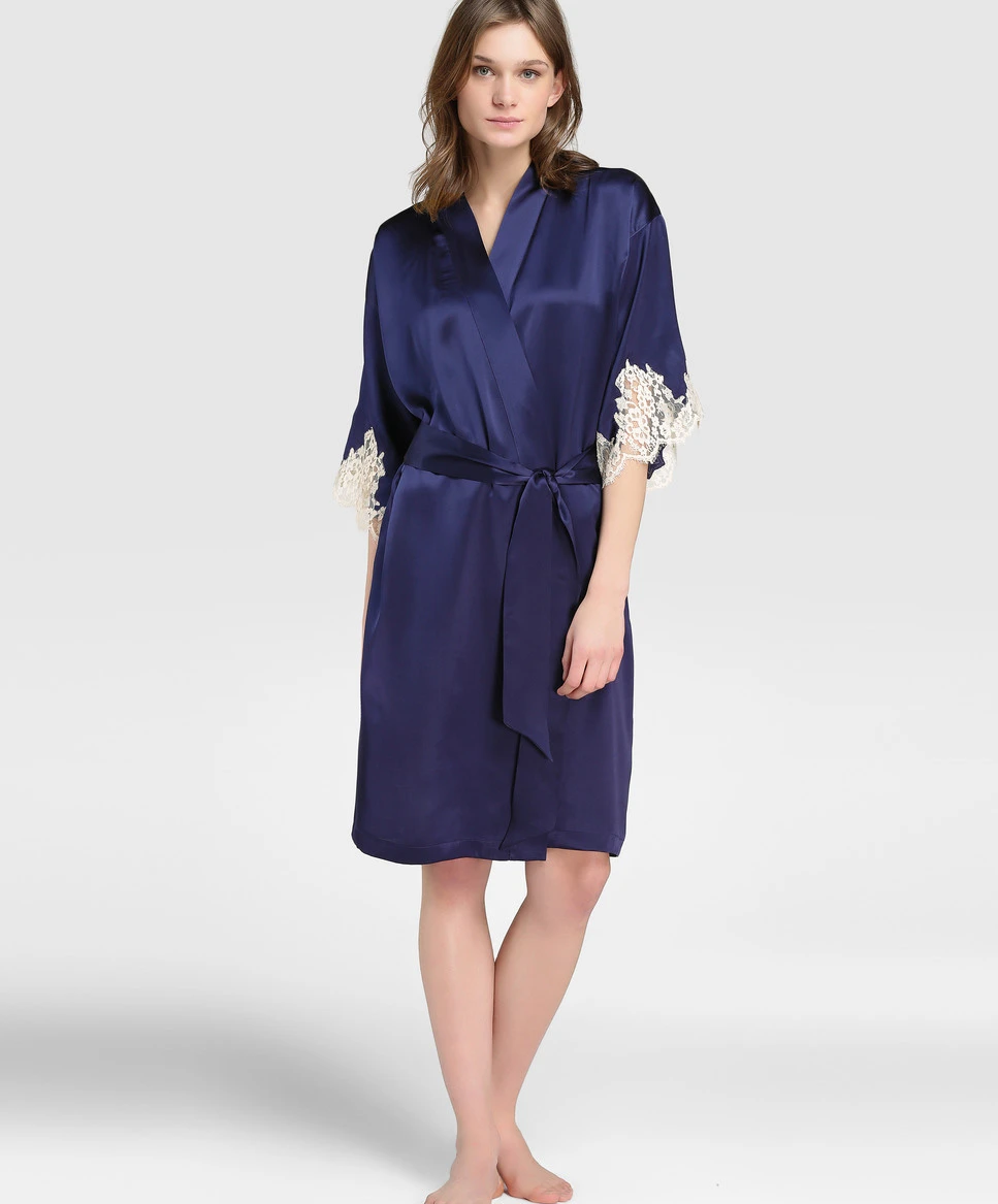 Déshabillé en soie Splendeur soie de chez Lise Charmel. Ce superbe kimono en satin de soie vous confèrera une élégance incomparable avec ses empiècements de dentelle de Calais aux manches notamment. Un ruban en soie à la taille vous permettra de nouer (et de dénouer!) ce superbe déshabillé long dans lequel vous resplendirez. Craquez pour cette robe de chambre en soie signée de la grande marque de lingerie française Lise Charmel !