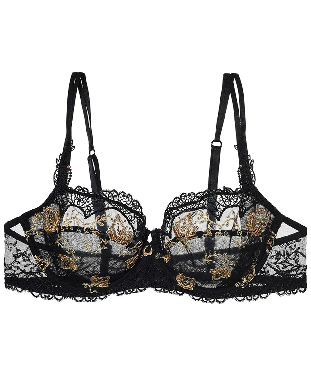 Soutien-gorge corbeille de la collection Exotic indie de la marque de lingerie Lise charmel effet pigeonnant en tulle brodé de bougainvilliers indiens graphiques enrichis de strass en cristal Swarovski. On craque en découvrant la transparence évocatrice, les jolis détails de guipure soulignant la basque et le décolleté et s’élançant au départ des bretelles spaghettis satinées, ainsi que le précieux anneau en zamack doré et strassé conférant à ce dessous une splendeur dont ils vous auréolera. Un soutien-gorge corbeille lise charmel luxe et raffiné tout simplement !