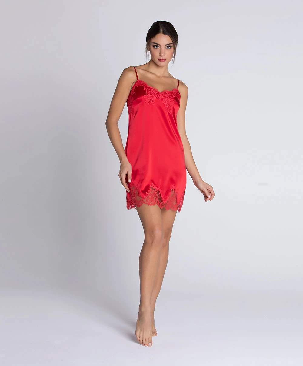 -Lingerie de nuit féminine confectionnée dans la soie, textile ô combien mythique par sa douceur et son confort exceptionnel. Le coloris rouge vif passionné est tout simplement radieux sur cette soie noble.