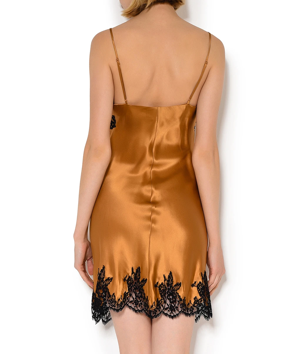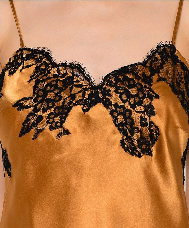 -Lingerie de nuit féminine confectionnée dans la soie, textile ô combien mythique par sa douceur et son confort exceptionnel. Le coloris ambre offre une luminosité époustouflante sur la soie et des reflets dorés aux délicieuses touches de caramel.