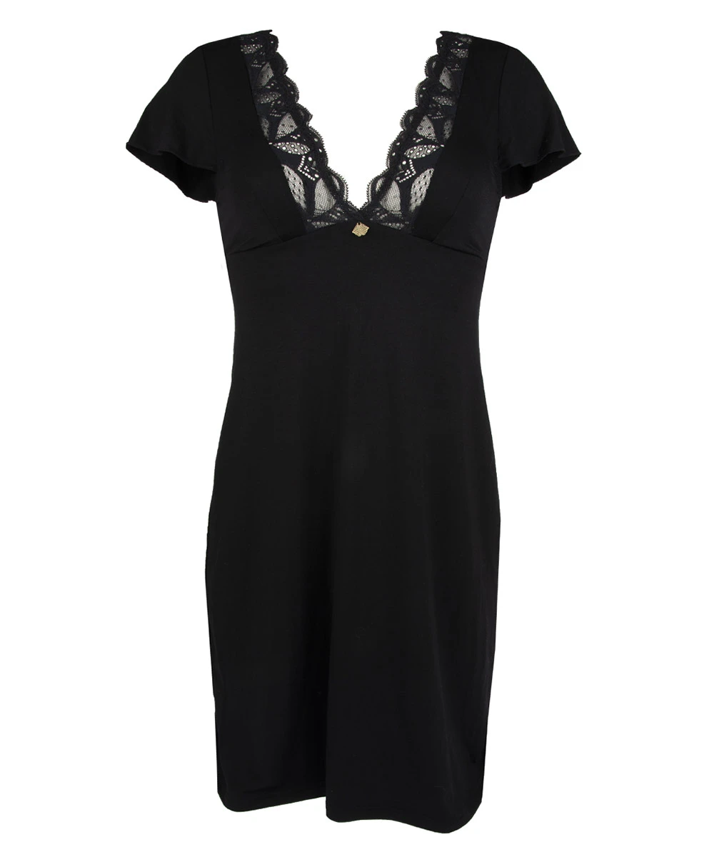 -Vêtement de nuit conçu à partir d’une maille en coton modal noire douce et soyeuse pour un bien-être et un fitting incomparables, associé à une résille et un dentelle plumetis florales et graphiques ton-sur-ton pour une originalité et un glamour décuplés.