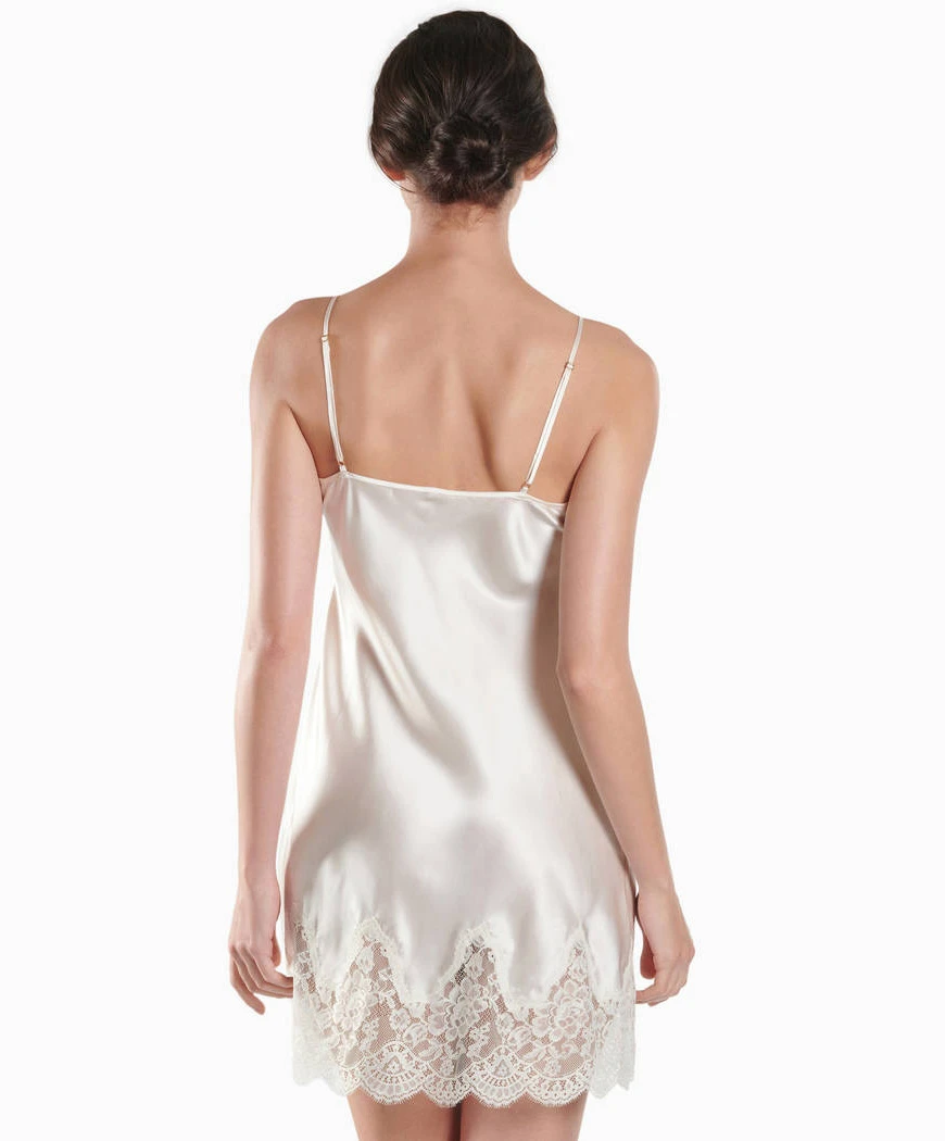 -Lingerie de nuit féminine confectionnée dans la soie, textile ô combien mythique par sa douceur et son confort exceptionnel. Cette matière légendaire à la radiance superbe y est complété par des inserts de dentelle Leavers ton-sur-ton d’un romantisme fou !