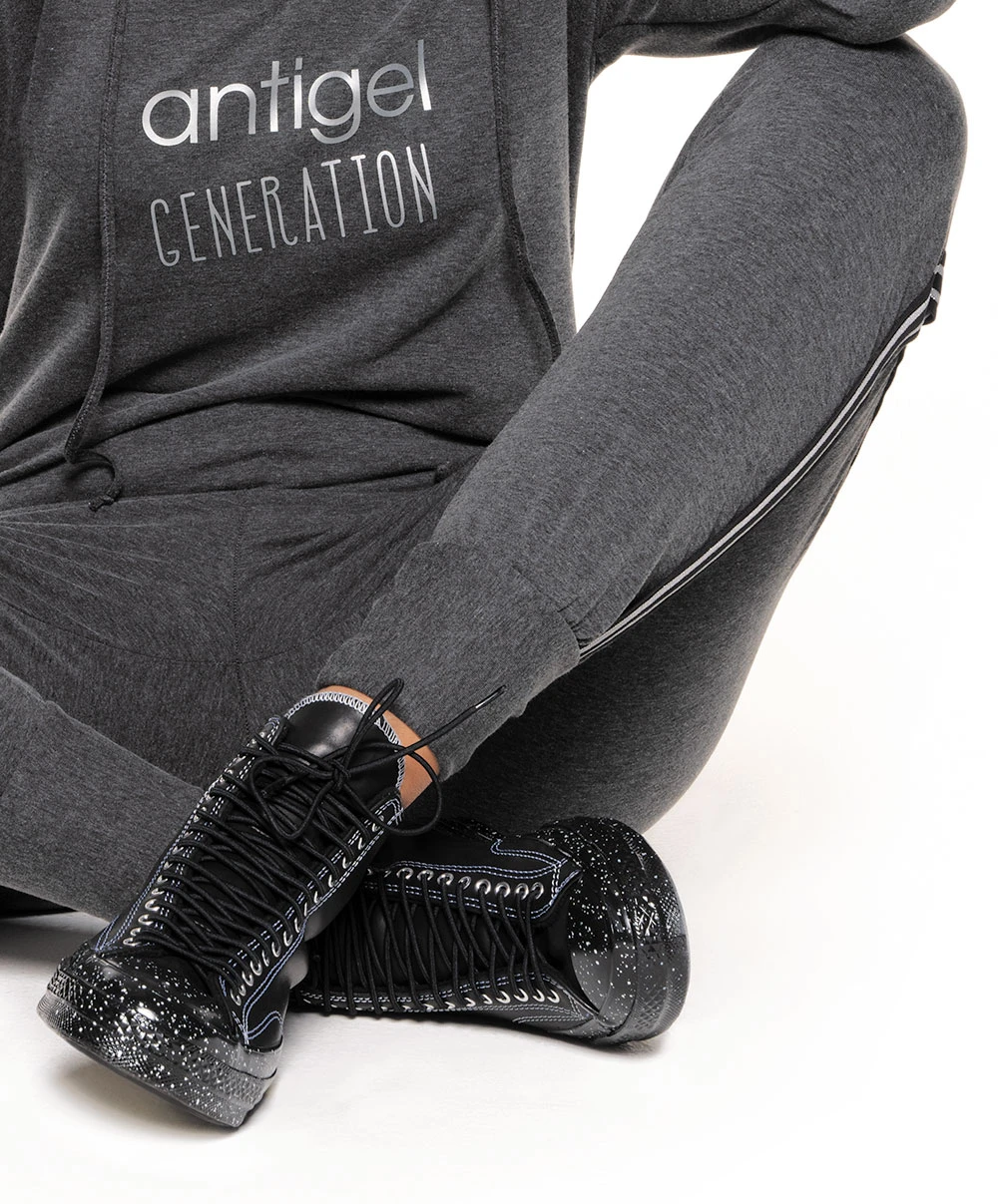 -Ce pantalon possède en finitions un élastique dissimulé à la taille pour un fitting parfait ainsi que deux bandes élastiquées noires et argentées sur les côtés pour renforcer le visuel sportif de cette création Antigel.