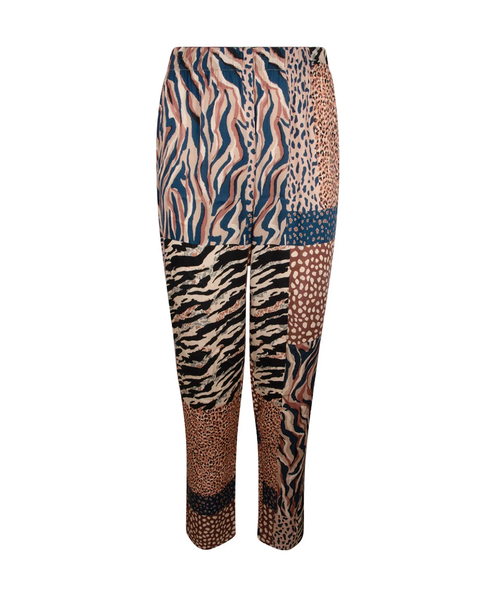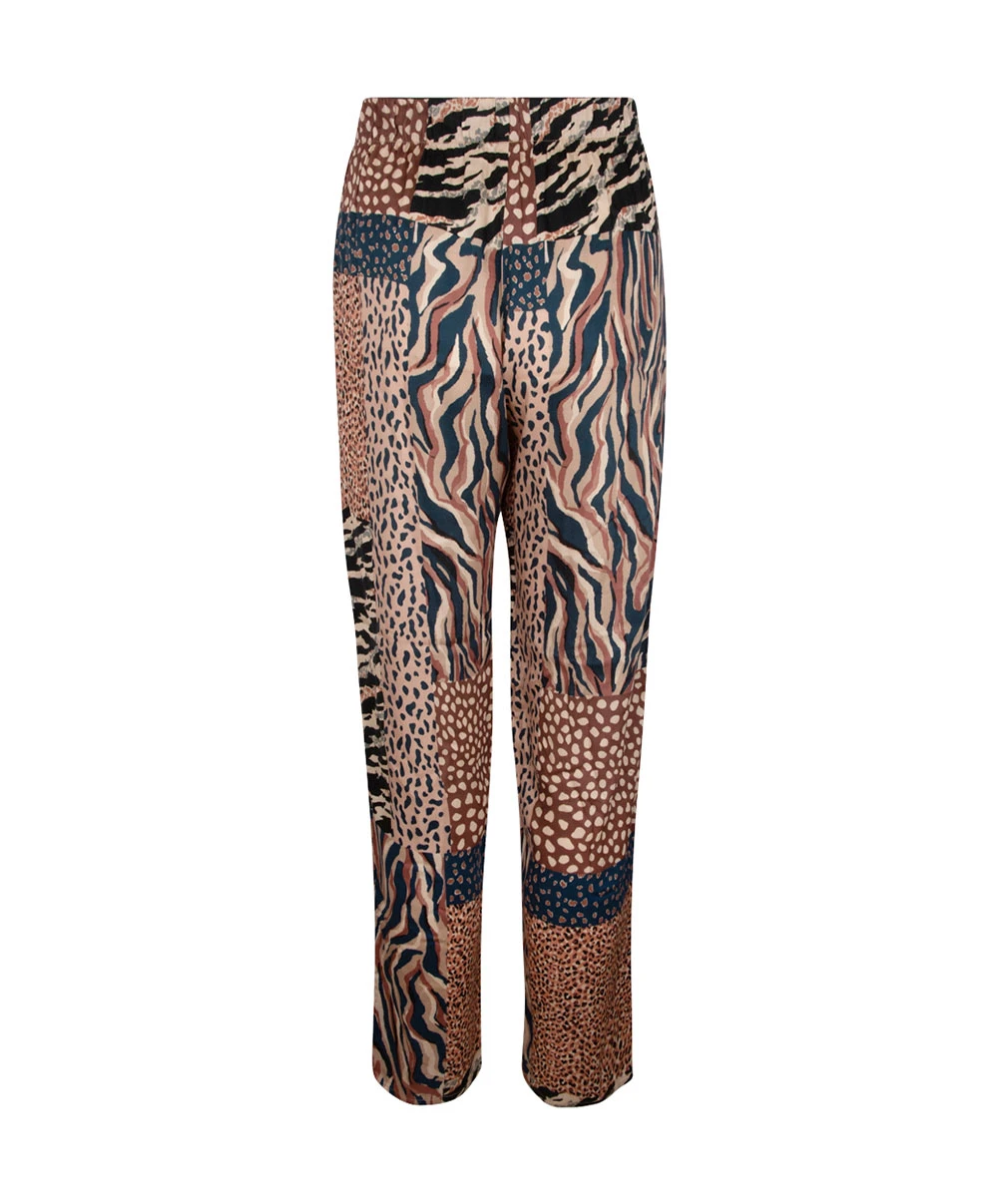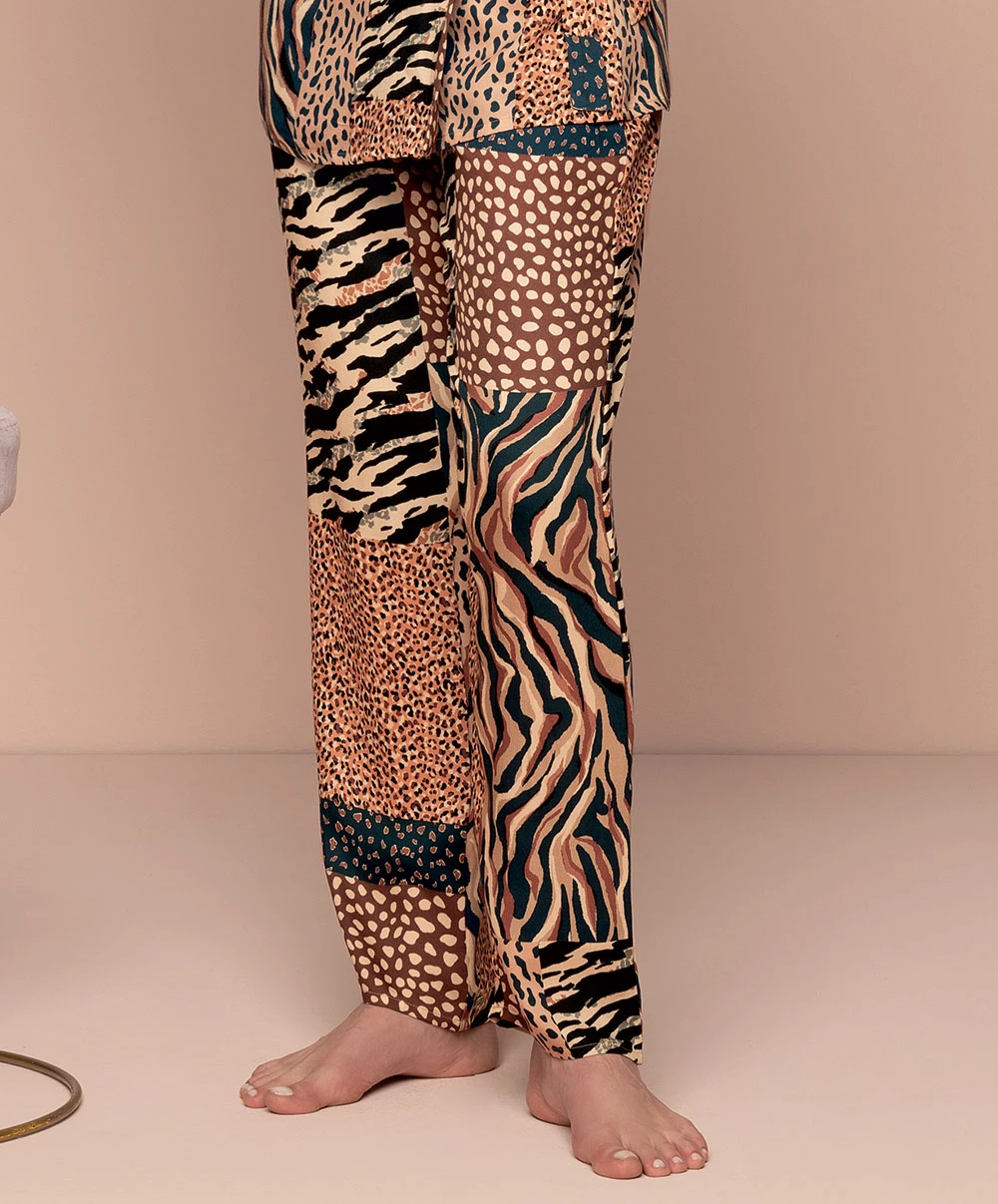 -Ce pantalon fluide offre une coupe plutôt ample pour une allure décontractée en totale adéquation avec les motifs animaliers en patchwork rappelant la mode vestimentaire africaine pleine de soleil et de légèreté.