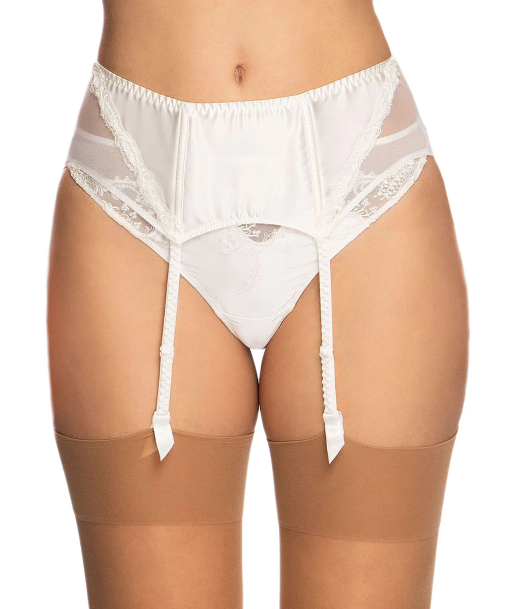 -Ce superbe serre-taille en soie se porte un peu plus haut sur la taille qu’un porte-jarretelles traditionnel et offre des superbes jarretelles satinées réglables pour s’adapter à toutes les morphologies. Vous y apprécierez également les guipures ivoires sur les côtés et les petits empiècements de tulle triangulaire qui confère encore plus de sophisticatoin à ce dessous !