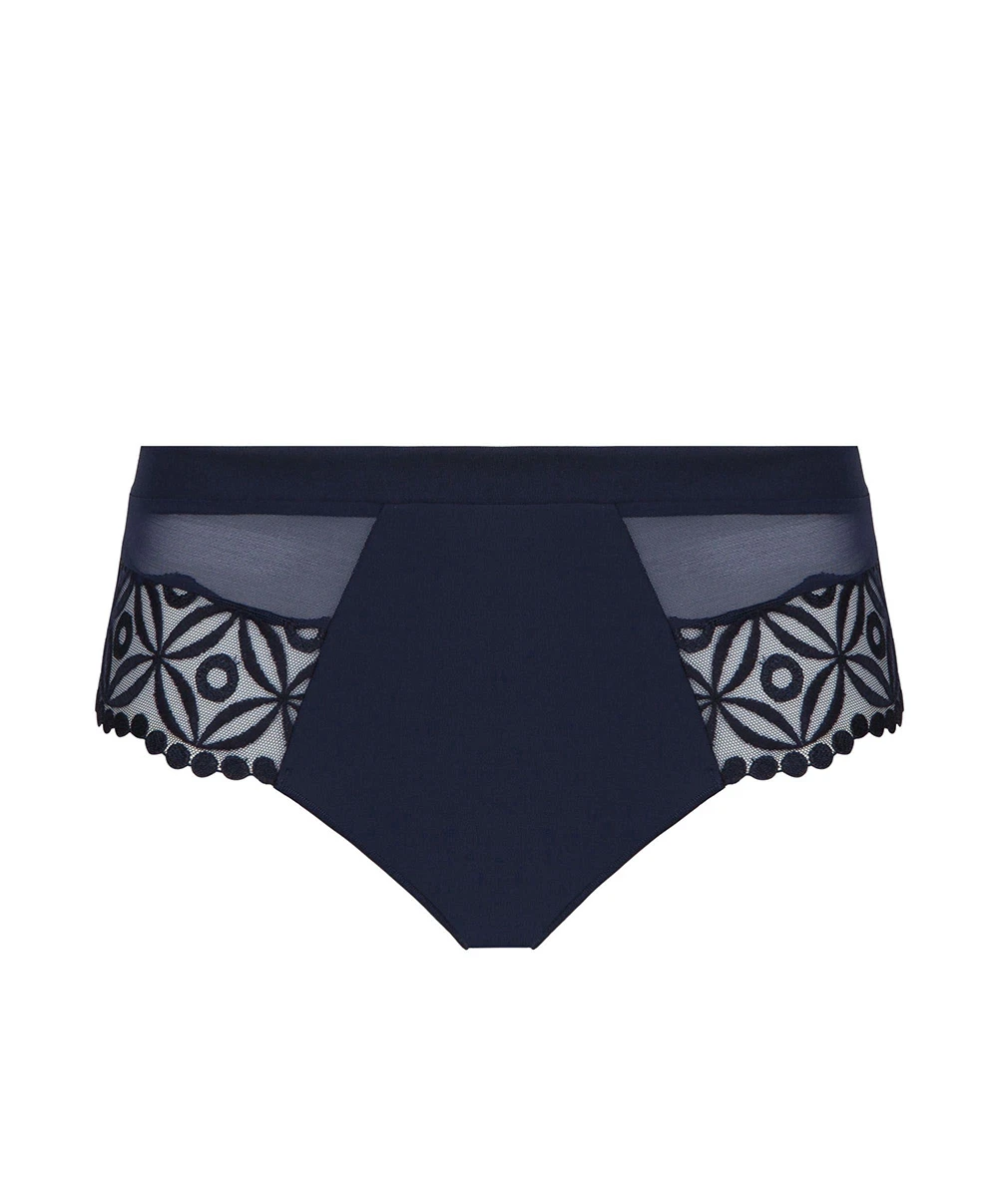 Culotte taille haute Instant de chez Simone Pérèle. Ce sous-vêtement est incontestablement un création phare de cette saison avec son design retro et sa broderie suisse aux motifs géométriques tendances. La hauteur de sa taille et sa coupe enveloppante embelliront toutes les silhouettes. Avec sa doublure en coton et sa maille opaque au dos, cet article de lingerie fine joue la carte de la discrétion et du réconfort rassurant. Vous ne pourrez bientôt plus vous passer de cette culotte bleu marine Simone Pérèle au quotidien !