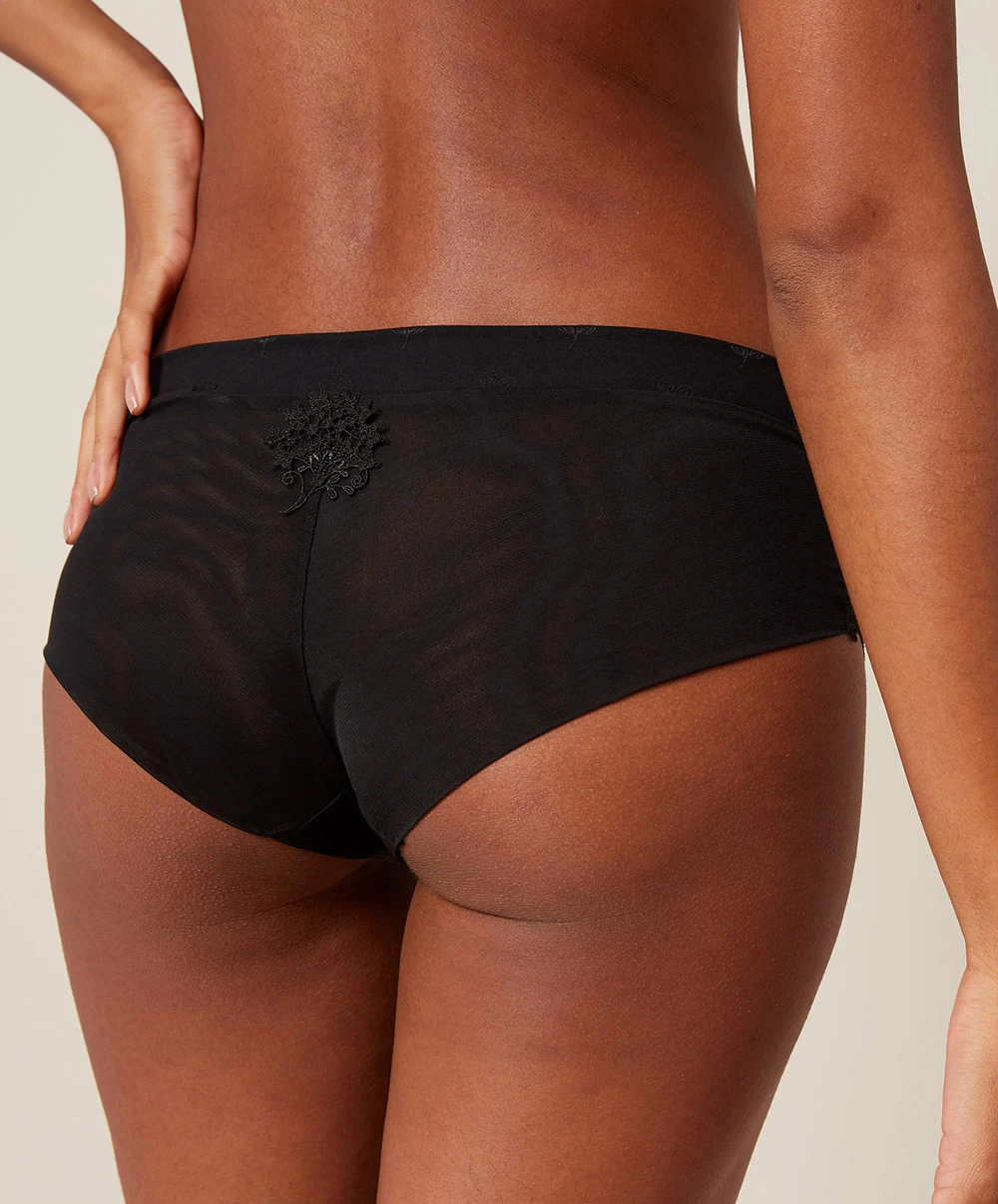 Shorty effet transparent en tulle trilobal aux broderies florales se dessinant sur la peau pour plus de sensualité et aux jeux de matières sexy. Intérieur doublé « string » devant pour plus d’opacité et de confort. Satin jacquard plié à la taille pour éviter les coutures et les élastiques et ne pas marquer. Dos transparent en tulle doublé pour une discrétion assurée et agrémenté d’un joli motif en guipure.