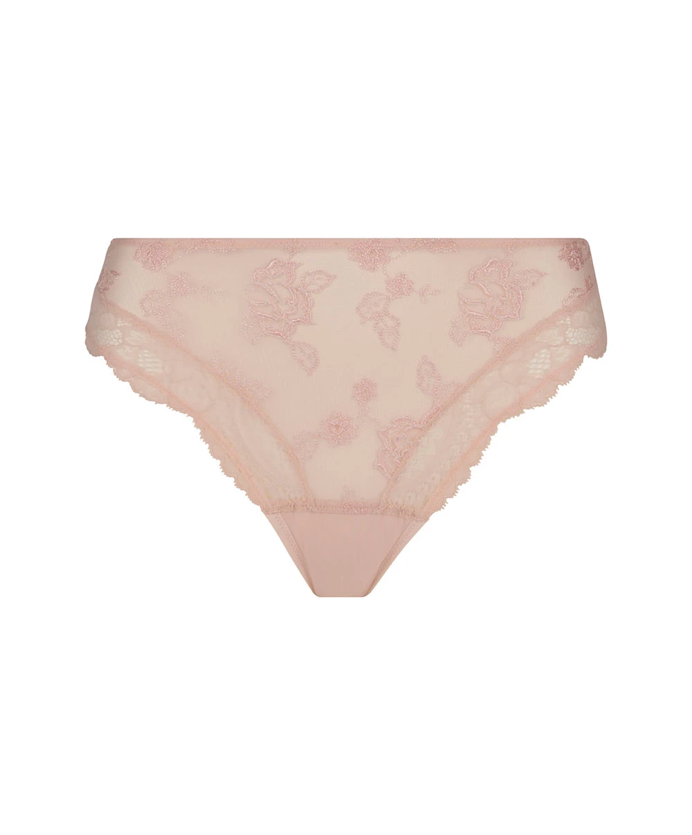 -Cette petite culotte joue le voilé/dévoilé avec devant la transparence (dentelle Leavers florale et tulle plumetis ajouré briodé de grandes fleurs) tandis que le dos est fait d’une maille soyeuse satinée rose pâle opaque pour vous apporter maintien et confort.