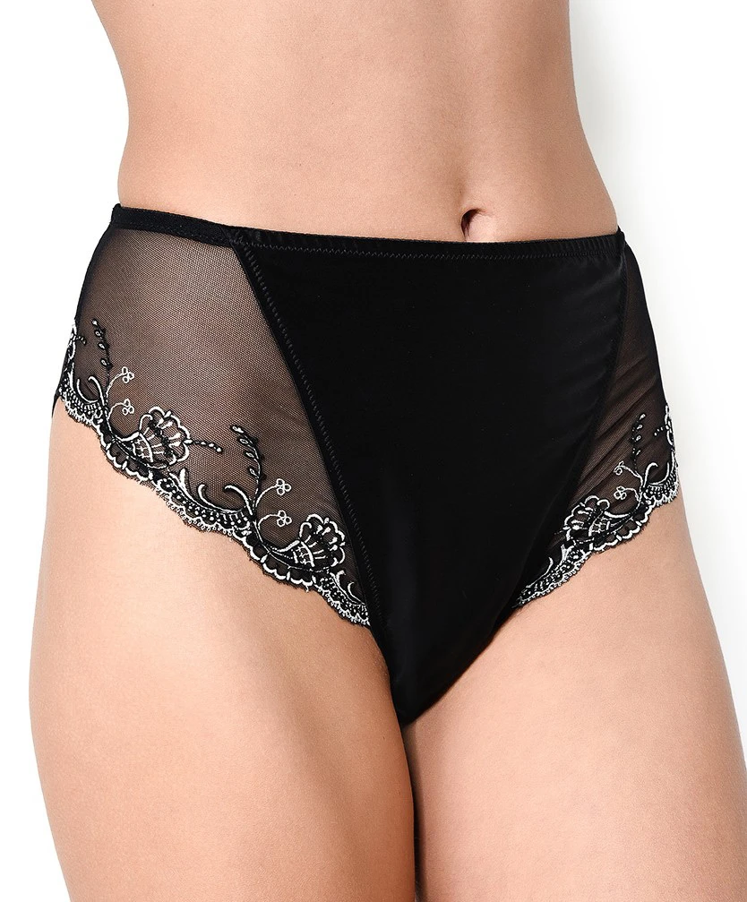 Slip haut Lise Charmel collection Splendeur Soie. Ce dessous somptueux à la taille mi-haute vous offrira une coupe enveloppante et une opacité pour un confort parfait et une rassurance idéale. Vous apprécierez les empiècements de tulle sur les côtés et au dos brodés de motifs majestueux nacrés qui apportent un côté aérien à cette culotte haute très élégante. Détails coquets : un petit noeud de satin surmonte la découpe de tulle triangulaire au dos.