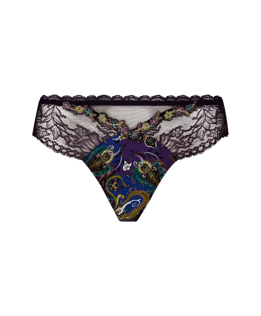 -Ce dessous chic est fait d’une maille confectionnée notamment en soie, textile ô combien mythique par sa douceur et son confort exceptionnel, alliée à une sublime dentelle de Calais florale ajourée très féminine et raffinée. Coup de projecteur sur le tissu imprimé représentant des motifs paisleys de toutes les couleurs pour une allure de reine orientale tout droit sorti d’un conte féérique.