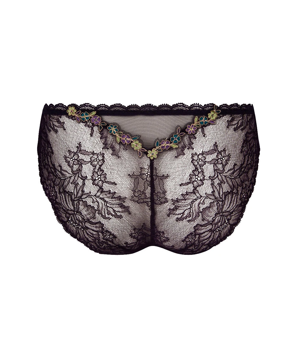 -Cette culotte sexy à la coupe modérément enveloppante offre une belle échancrure flatteuse pour vos jambes devant et un dos travaillé tout en ajourage qui met en valeur le galbe de vos fesses de fort belle manière. Le sex-appeal de ce bas de lingerie de charme est décuplé par les jeux de transparence ultra-séducteurs de la dentelle de Calais et du tulle.