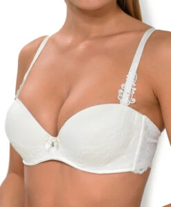 Soutien-gorge bandeau push-up de la collection Exception Charme de chez Lise Charmel. Ce soutien-gorge bandeau propose des bonnets à coques lisses en mousse rigide ornée d’une laize de dentelle de Calais florale sur la partie inférieure se prolongeant dans le dos, offrant une basque des plus élégantes. Le séparateur y est orné d’un merveilleux bijou en zamak argenté Swarovski Elements qui donne un effet un effet précieux. La coupe de ce soutien-gorge push-up vous fera gagner jusqu’à une 1,5 taille et vous offrira une poitrine recentrée, réhaussée et repulpée pour augmenter votre sex-appeal. Les bretelles dont le départ est orné de guipure majestueuse sont amovibles, extensibles et réglables pour d’adapter à toutes les morphologies et à toutes les envies.