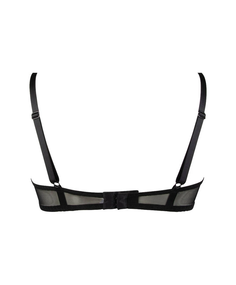 – Soutien gorge corbeille à armature, superposé d’une bande style bandeau en tulle flocké habillée d’un picot au décolleté. Dos en tulle. Bretelle à la continue.
