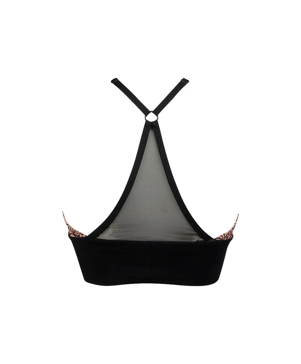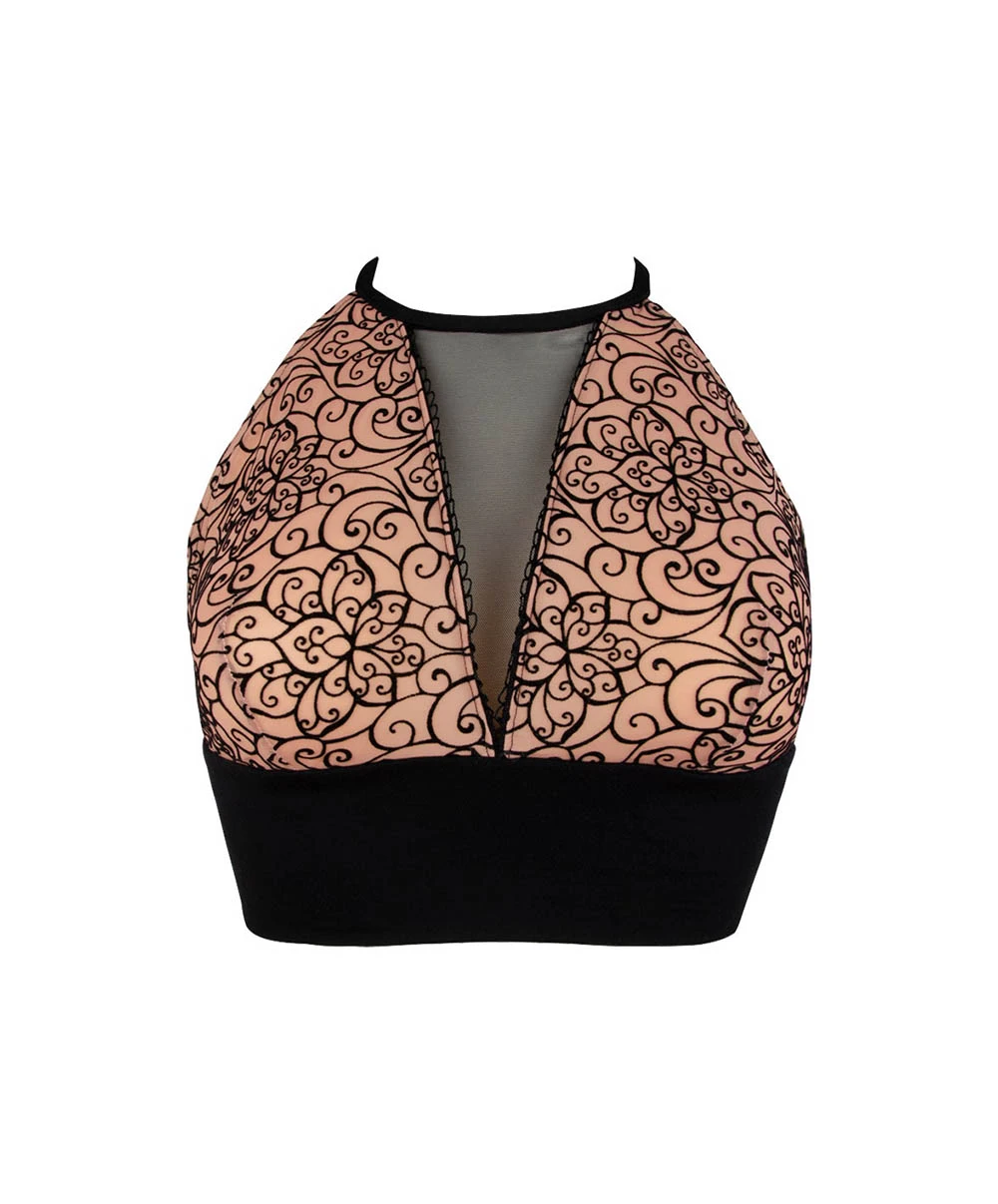 – Brassière en tulle flocké sur basque en modal. Ajourage en tulle milieu devant et milieu dos.Bretelles réglables.