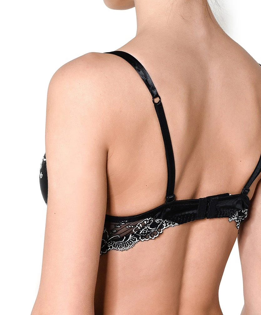 Soutien-gorge coque Lise charmel collection Splendeur soie. Ce soutien-gorge coque en soie noir propose deux formes : bonnets coques fines (Bonnets C et D) ou bonnets en mousse progressive (Bonnets A et B) pour un effet push-up sexy. Les coques intégrées aux bonnets galbent la poitrine pour un bel effet bombé à tomber. Un tulle brodé inonde le décolleté offrant une grande richesse visuelle à ce sous-vêtement. Véritablement l’une des plus envoutantes créations de la marque de dessous français avec en finition un petit noeud en soie agrémenté d’un bijou swarovski.