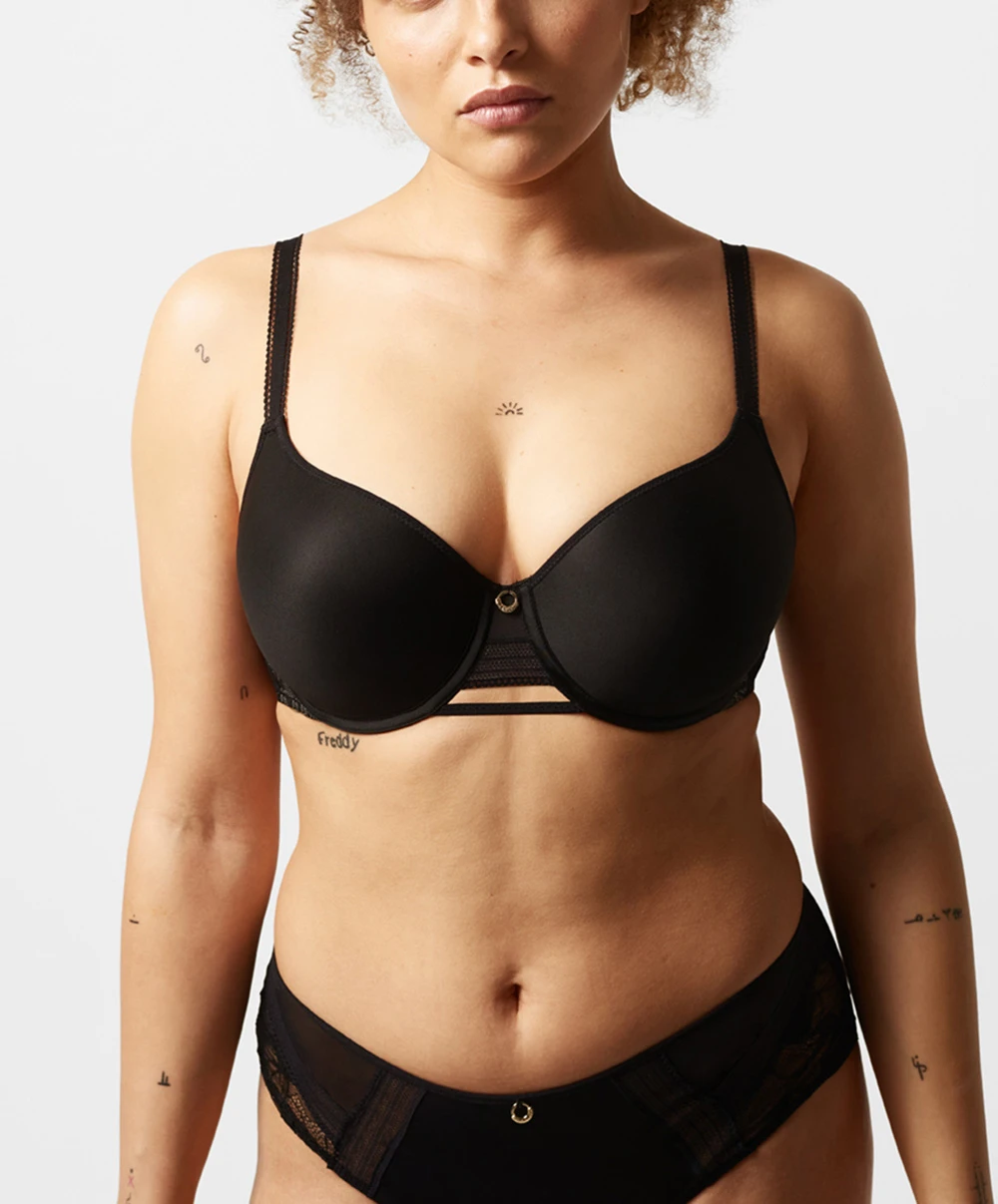 Soutien-gorge coque à mémoire de forme très enveloppant de la marque de lingerie Chantelle, collection True Lace, coloris noir.