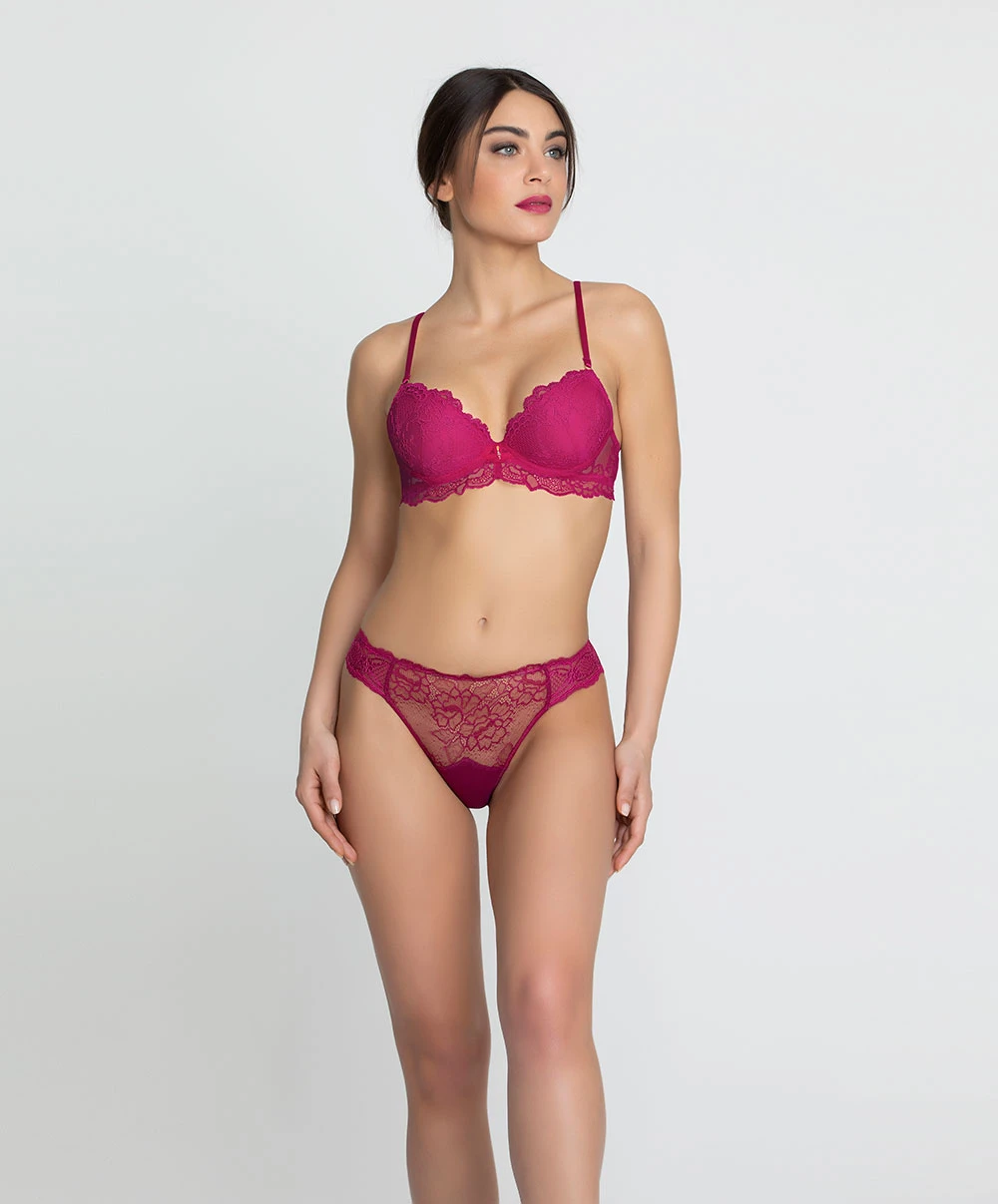 La collection de lingerie fine Sublime en Dentelle par Lise Charmel : cette ligne de lingerie dentelle très complète revient cette saison en coloris fuchsia et toujours son mariage sophistiqué de broderies, de crêpes de soie, de laine et de dentelle française labellisée Calais-Caudry… Soutiens-gorge sexy aux coupes variées offrant de magnifique décolletés, culottes aux formes audacieuses et aux jeux de transparence dévastateurs, porte-jarretelles assortis… Autant d’éléments qui font de cette superbe ligne de lingerie de charme un must-have dont les parures laisseront votre partenaire bouche bée…