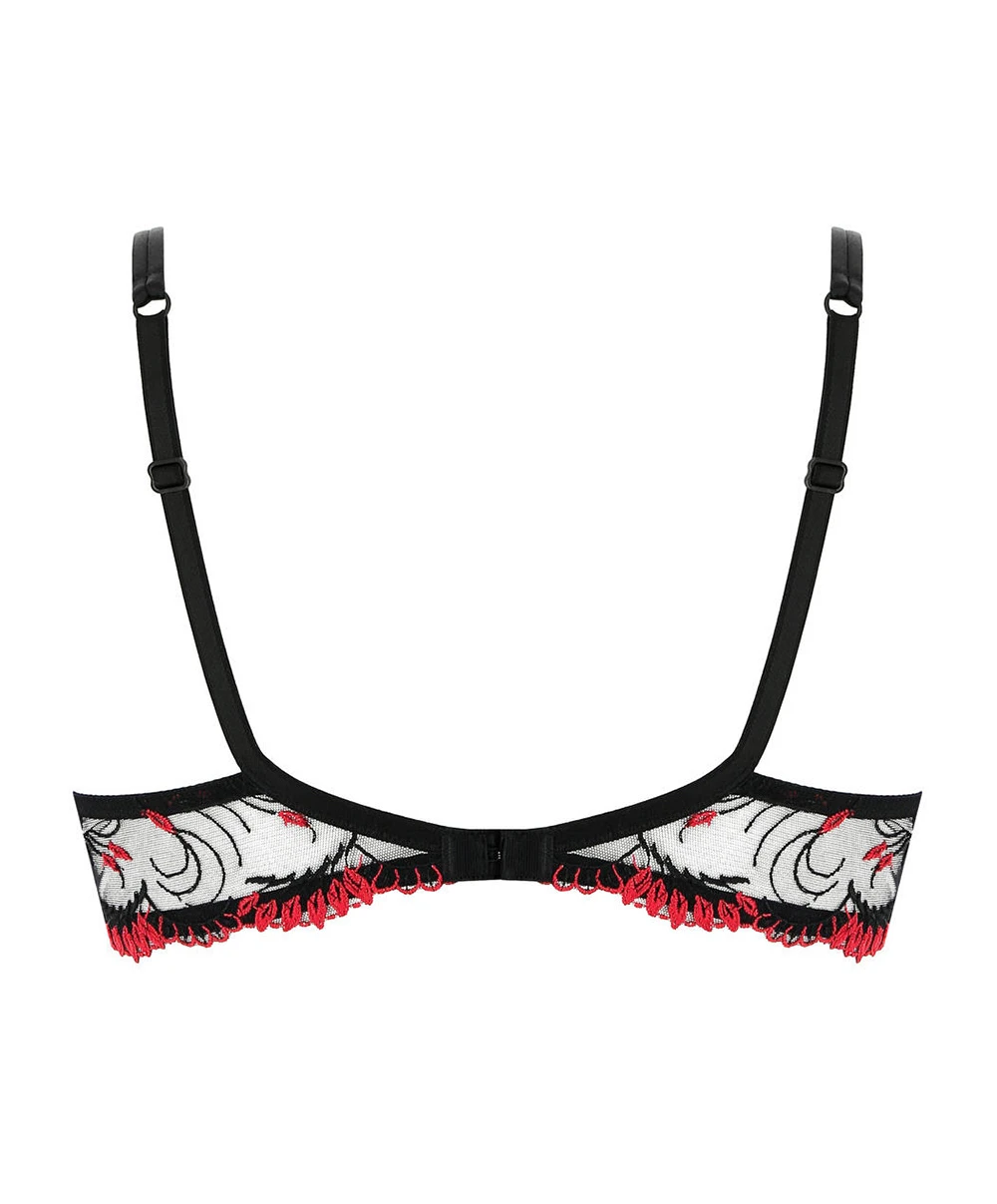 Soutien-gorge coque Lise Charmel collection Écrin Désir. Ce soutien-gorge Lise Charmel à coques en mousse (mousse progressive légèrement rembourrées uniquement sur les bonnets A et B pour un léger effet push) vous assure un soutien impeccable et une poitrine galbée et arrondie. Le tulle noir jaugé fin dans lequel il est confectionné arbore de superbes broderies rouges et des guipures chatoyantes contrastantes des plus subimes. L’association du rouge et du noir y est plus que jamais synonyme de passion dévorante et les anneaux en zamak sertis de cristaux rubis ainsi que le bijou fantaisie écarlate au séparateur éclatant signés Swarovski donnent un visuel très précieux à ce dessous chics Lise Charmel.
