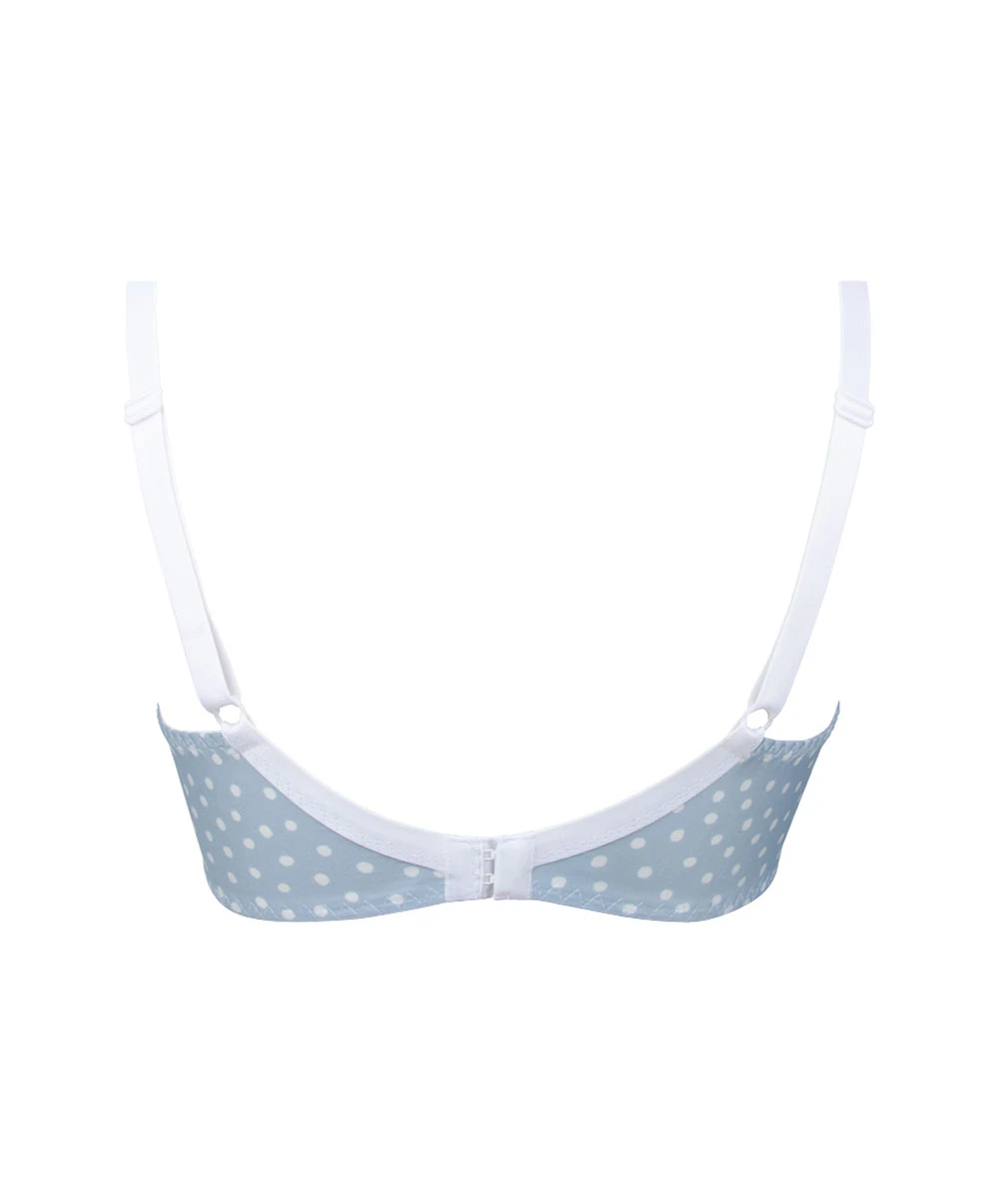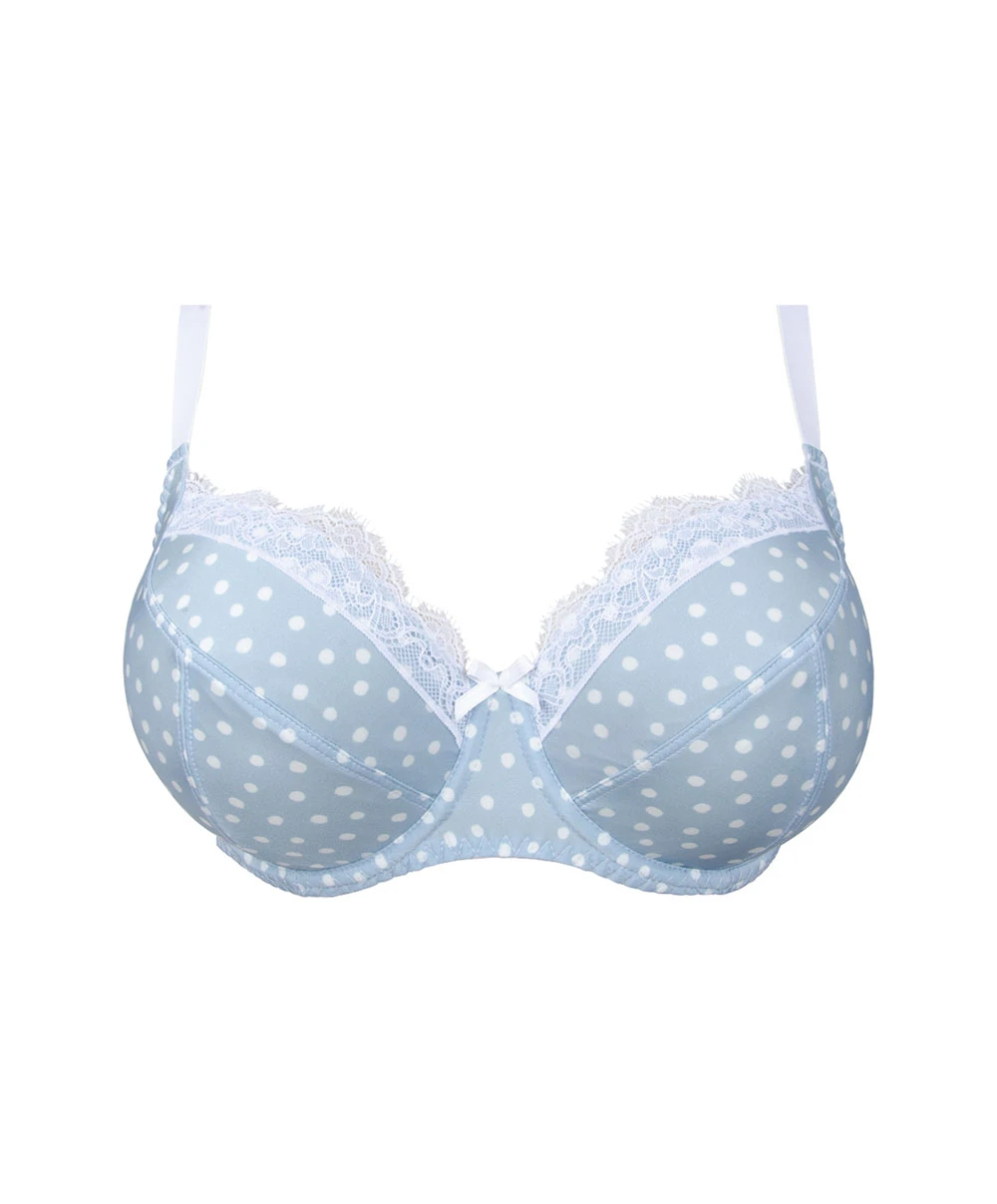 -Soutien-gorge type corbeille/balconnet emboitant aux 3/4 au motif très élégant à pois blancs sur un fond bleu ciel pastel plein de douceur et d’élégance pour une silhouette à la fois vintage, chic et glamour façon pin-up… Séduction garantie !