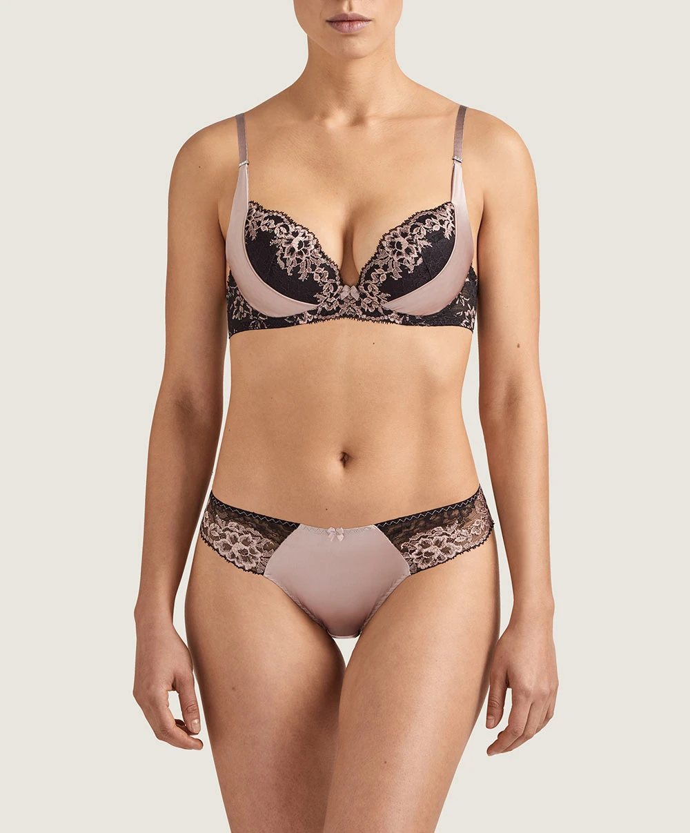 -Aubade propose ici un décolleté novateur et sexy avec une coupe plongeante et un soutien-gorge haut-de-gamme qui pourra vous faire gagner jusqu’à une taille de bonnet grâce aux coussinets amovibles dont vous pourrez rembourrer les bonnets pour recentrera et repulper votre poitrine tout en favorisant son galbe naturel et son maintien vers le haut.