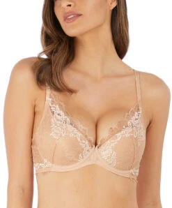 Soutien-gorge push-up plunge Wacoal de la collection Lace Perfection, coloris café crème (=peau et détails ivoires).