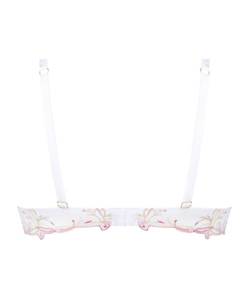 -Ce soutien-gorge sans armature offre une forme triangulaire rétro-chic au décolleté plongeant très sexy et une apex plutôt haute. Quand l’apex est haute, elle donne l’effet d’une coupe en forme de triangle/foulard, à la pointe des tendances lingerie de ces dernières années ! La ligne de décolleté y est admirablement souligné d’un tulle brodé de fleurs pastelles multicolores permettant de découvrir en toute élégance le grain de votre peau sans trop en dévoiler pour une allure très glamour. Affranchissez-vous des contraintes des armatures et lovez-vous dans ce superbe soutien-gorge sans baleines placé sous le signe du confort et de la séduction !