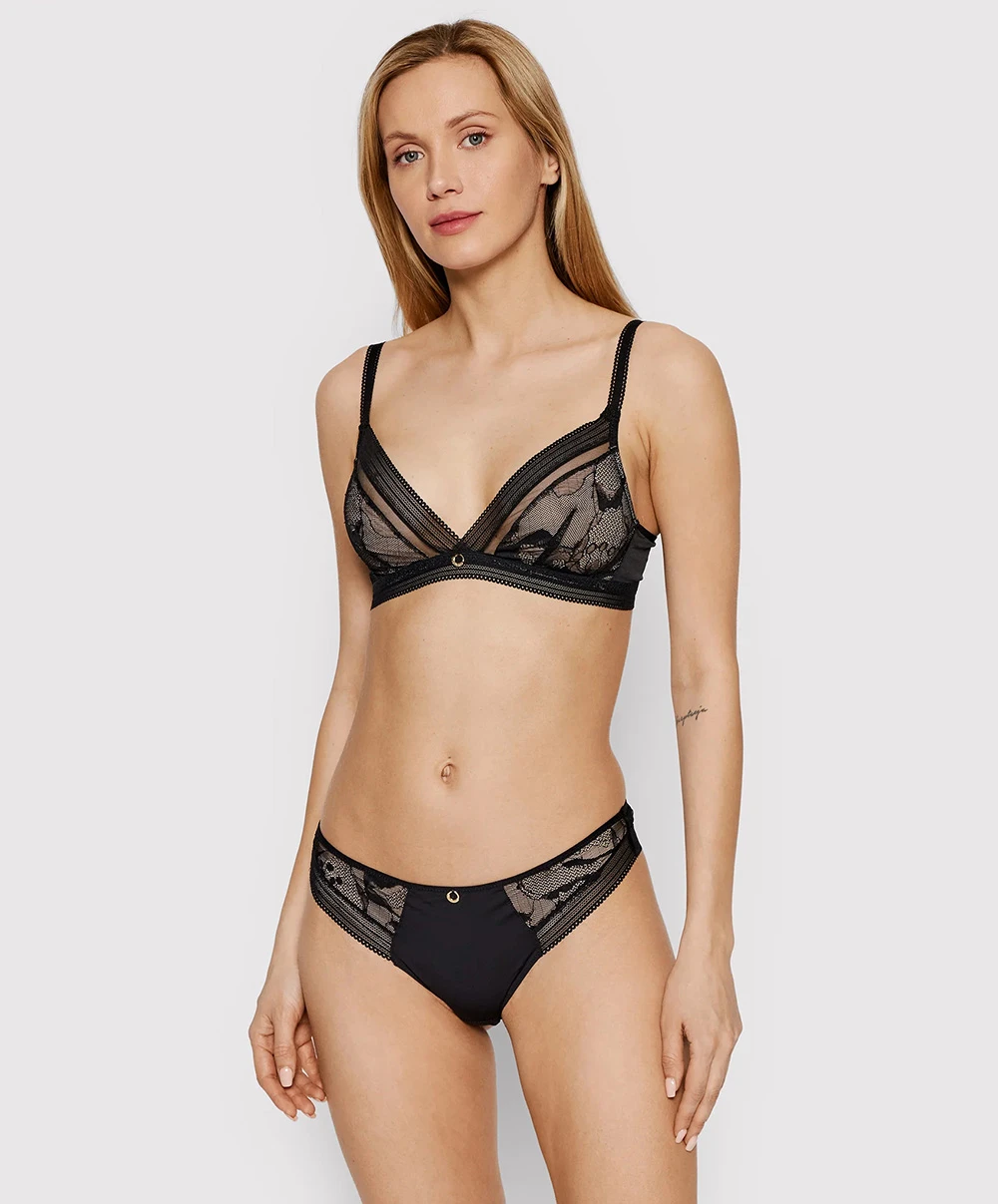 -Cette brassière sans armatures offre une forme de type « foulard » et de fait un décolleté plongeant très sexy. Ses bonnets triangulaires en font une pièce tendance avec un petit côté rétro chic de lingerie vintage, plébiscitée ces dernières saisons. Il est travaillé toute en transparence avec ses dentelles florale et graphique et son tulle pour une séduction assumée. Ce soutien-gorge sexy se rapproche du style « bralette » (pour utiliser un néologisme venu de l’Anglais) et possède une bande sous-poitrine plutôt large et un décolleté plongeant séducteur. Celles qui n’ont pas froid au yeux la porteront seule ou la suggèreront de manière très sexy sous un chemisier ou une veste par exemple. En revêtant ce soutien-gorge, vous vous libèrerez de la contrainte des armatures puisqu’il ne possède pas de baleines qui pourraient vous paraître inconfortables.