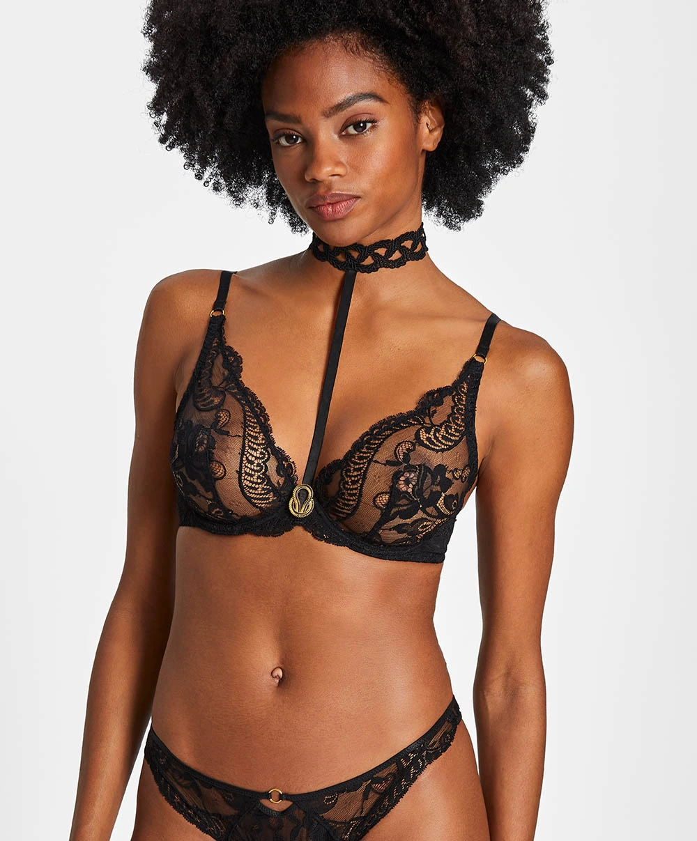 La collection haut de gamme à découvrir absolument. Un raffinement ultime avec une dentelle de leavers noir absolu et des bandes guipure au tressage délicat qui magnifient la silhouette. On adore l’esprit bondage réinventé entre élégance et érotisme absolu avec ses liens satinés stretch. Et que dire du bijou entrelacé doré et de la bande guipure amovible en collier qui représentent forcément la signature de la collection.