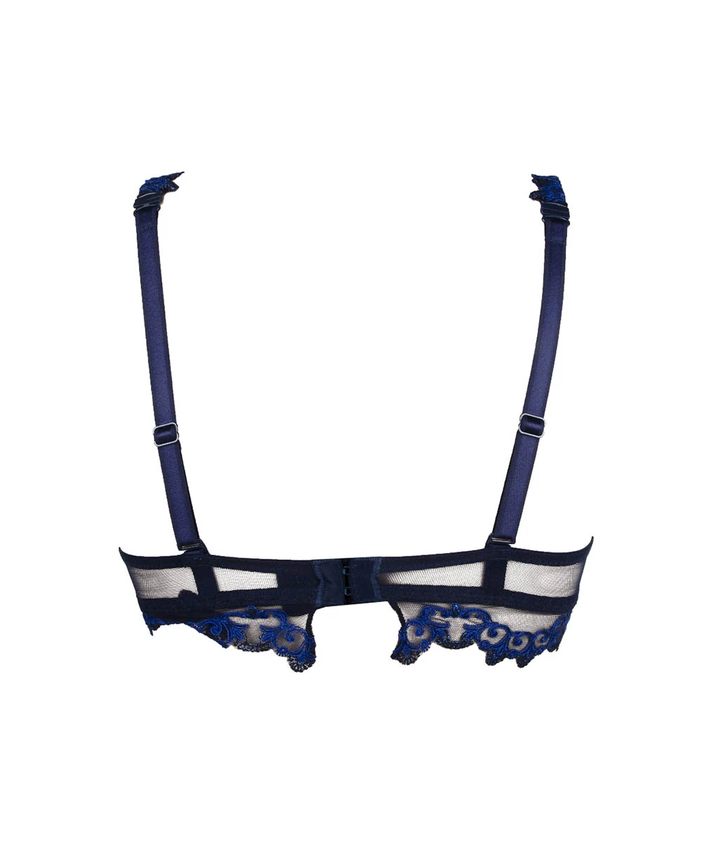 Une ligne de sous-vêtement féminins pour rayonner dans la nuit. Elégant et festif, ce soutien-gorge lise charmel se pare d’une broderie italienne lumineuse avec ses fils brillants et métallisés pour un effet reflet d’eau. Un résultat splendide et surprenant comme toujours avec les créations de la célèbre marque de lingerie française. On adore les modifs graphiques étoiles filantes et feuillage qui se dessinent sur un fond tulle transparent. Le camaïeu de bleus plaira aux femmes qui recherchent un dessous envoutant et luxueux. Ce modèle triangle offre un décolleté plongeant enrichi avec les hauts bonnets qui remontent jusqu’aux épaules. La basque est sublime avec ses détails de broderie. Un véritable bijou à porter.